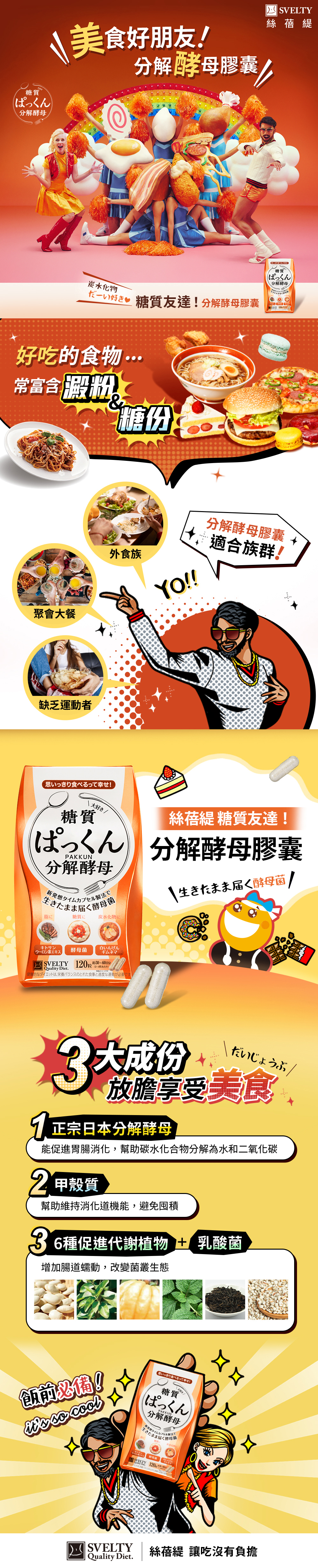 美食好朋友!日本品牌 絲蓓緹 Svelty 在日本銷售超過13年,了解一般人難以改變飲食習慣,以3重機制:分解、包覆、阻斷讓你放膽吃美食~