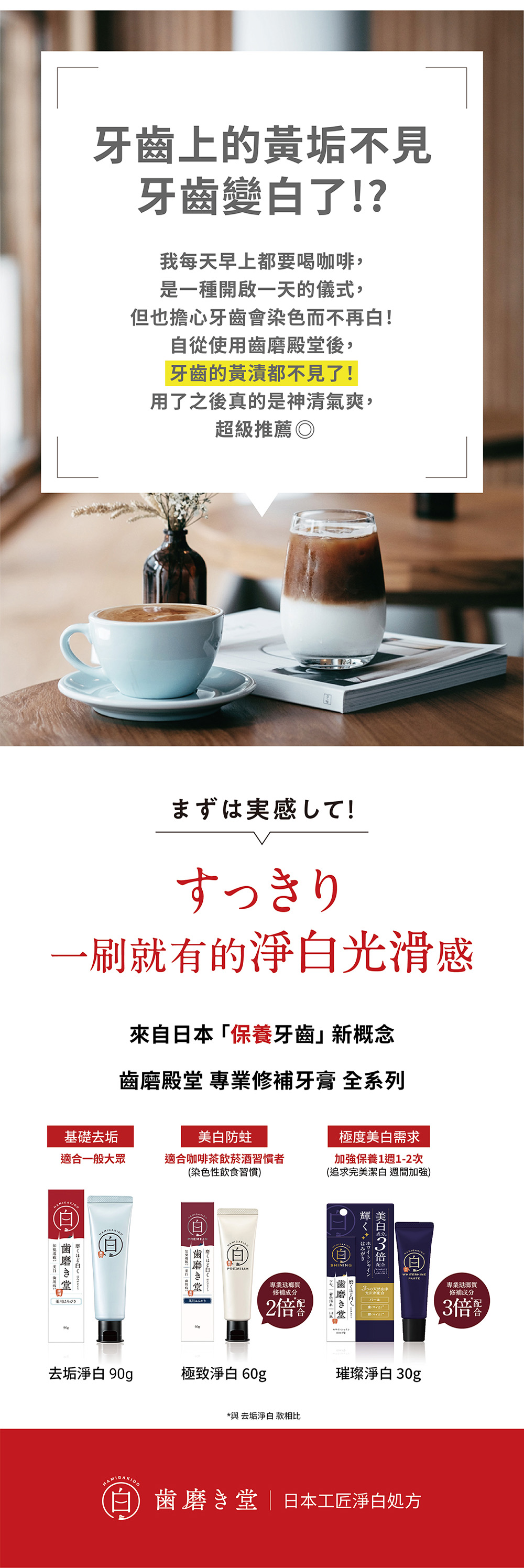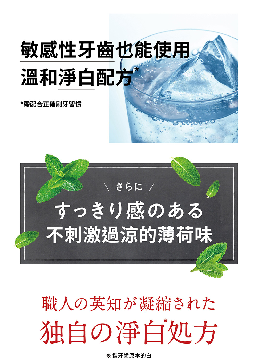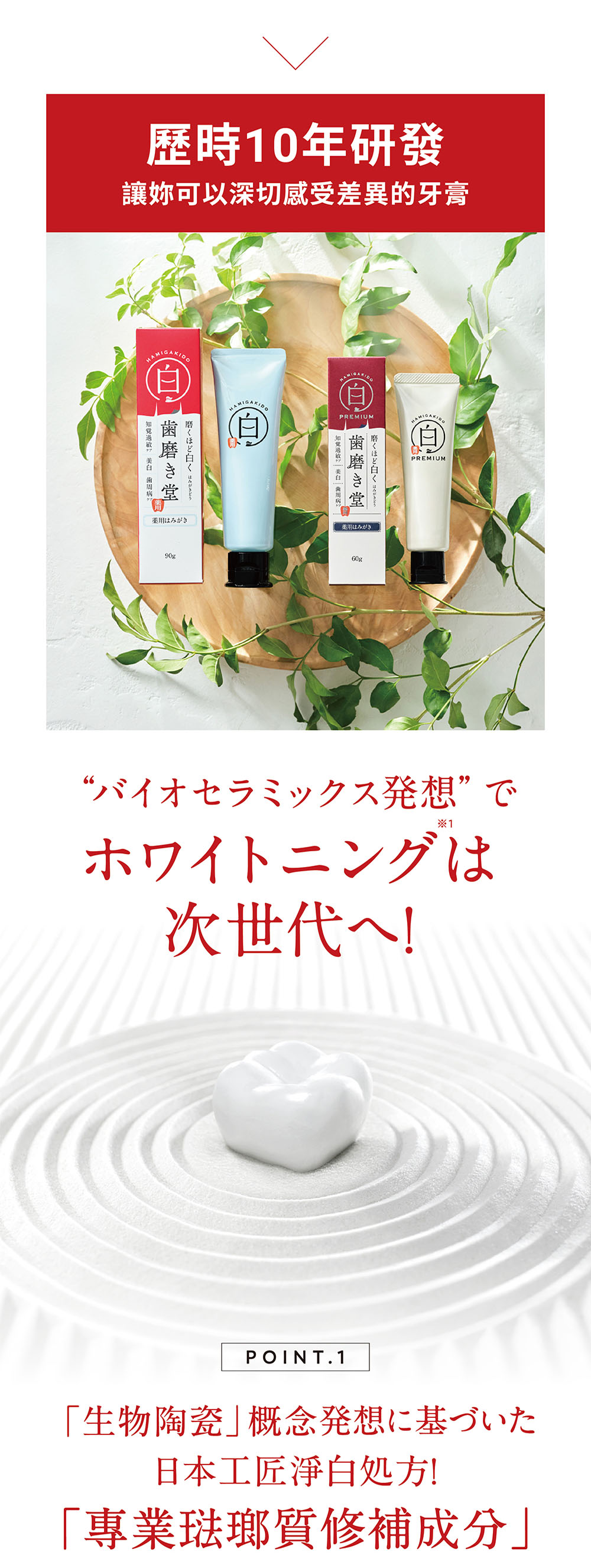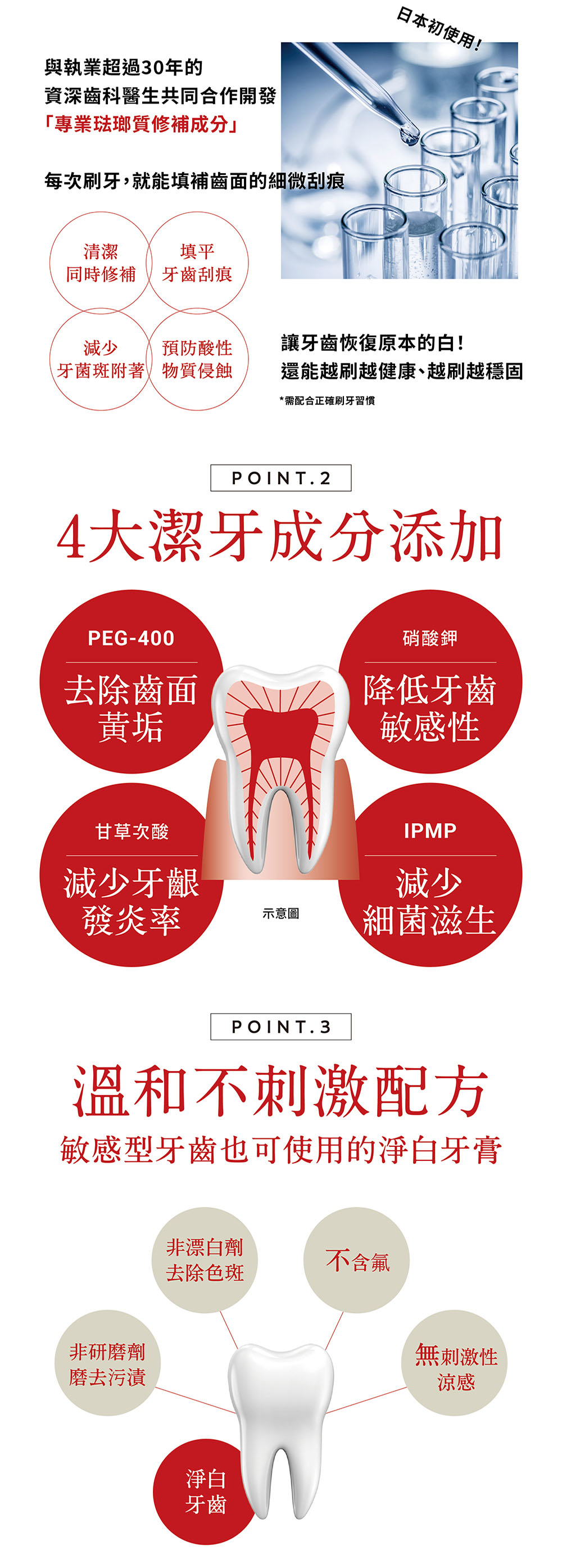 來自日本,與執業超過30年的資深齒科醫生合作,歷時10年開發出專業琺瑯質修補成分。每次刷牙都能填補齒面的細微刮痕,讓牙齒光滑減少斑垢。溫和不刺激,越刷越健康,讓你天天擁有健康美齒!